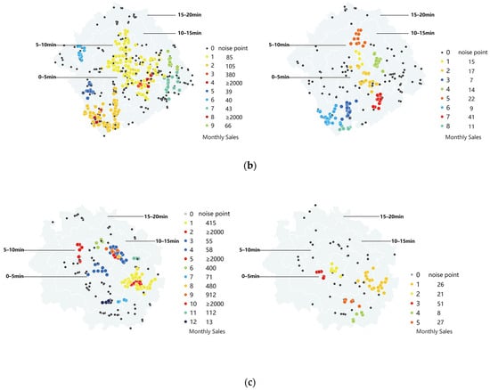 Additionally, we employed the DBSCAN algorithm to identify the heterogeneous distributions of store clusters with similar sales efficiency. DBSCAN is a machine learning clustering algorithm known for its ability to consider both spatial and attribute data simultaneously, allowing it to detect spatial clusters of arbitrary shapes while identifying noise points. The algorithm relies on two key parameters: the neighborhood distance (Eps) and the minimum number of samples contained in the Eps neighborhood (MinPts). In this study, the algorithm was implemented using Python. The specific parameters were set as follows. The data dimensions included geospatial coordinates and sales, MinPts = 5, Eps = 100.