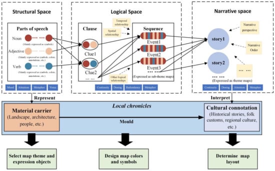 Travelling is a journey into the unknown, and reading maps is undoubtedly a direct way to learn about unknown areas []. Tourist maps are therefore the most important resource for tourists and should theoretically be able to answer all the questions about a destination visited by tourists []. Satisfying individual needs has become the primary focus of tourist mapping research [,,]. Basic map elements are used to represent landmarks and points of interest to provide navigational guidance for tourists [,,]. However, with the growing market demand, traditional maps that are monotonous and rigorous are no longer sufficient. Visually pleasing artistic maps and vivid narrative maps are increasingly valued in the field of tourist maps [,]. Meanwhile, the cultural value of cities and scenic spots is recognized and explored by people; culture has become a significant aspect of the modern tourism industry []. Local chronicles, as a type of public cultural product, provide detailed records of local historical development and contain numerous unique historical and cultural resources, such as historical figures, events, customs, and cultural relics. They are closely related to cultural heritage and serve as highly representative local cultural resource. Scholars have attempted to develop map visualization methods based on local chronicles to reflect local cultural connotations []. However, the full potential of cultural resources in local chronicles has not been fully utilized. More importantly, previous studies lack an in-depth consideration of the relationship between maps and structural linguistics and focus more on the visual effects of maps. As a result, the narrative function and representativeness of tourist maps may not be guaranteed.