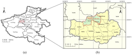Location of the Songshan Scenic Area: (a) the location of Dengfeng in Henan Province; (b) the location of the Songshan Scenic Area in Dengfeng.