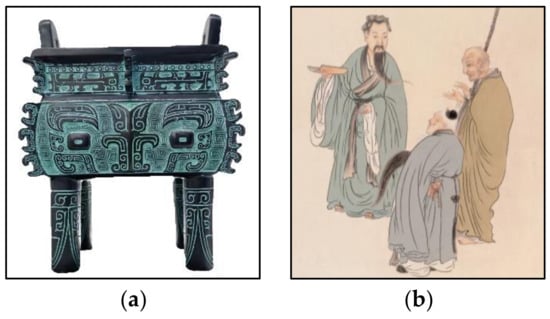 Sources of inspiration for the color design: (a) Bronze ware—ding; (b) Three religions: Confucianism, Buddhism, and Taoism.