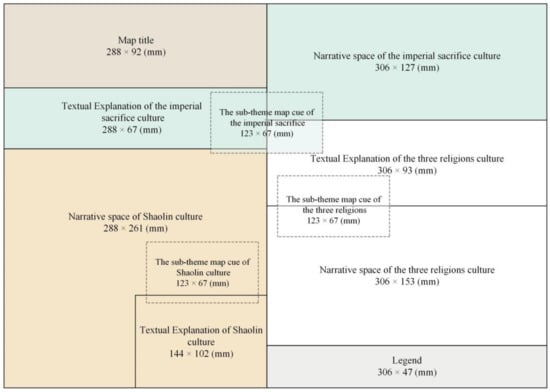 The theme map in this study is of A2 size (420 × 594 mm). Except for the title at the top and the legend at the bottom, the entire page is divided into three subspaces to describe the three representative cultural contents of Songshan Mountain (Figure 4). Each subspace contains a textual explanation and a narrative space for a culture; they are visually linked by their respective sub-theme map cues. The theme map follows a narrative order from a large scale to a small scale (continuity). The imperial sacrifice culture describes the reverence that people have for heaven and earth. The three religions culture represents the unique ideology of social groups. Shaolin culture is an important component of the three religions culture (metaphor). The three cultures, ranging from heaven and earth to the crowd, decrease in scale sequentially. The three cultures are presented in the order from top to bottom, which aligns with the general habits of readers. Meanwhile, the sub-theme map cues guide the readers’ gaze and establish the first layer of visual hierarchy. As readers explore the sub-theme map cues, their gaze naturally shifts to the corresponding narrative spaces, forming the second layer of visual hierarchy. Different narrative spaces consist of different expression objects, constituting the third level of visual hierarchy (attention). This visual hierarchy effectively helps readers understand the design intent of the map. Lastly, the selection of the three cultures follows the dosing principle, representing the rich and colorful cultural heritage of Songshan Mountain (dosing).