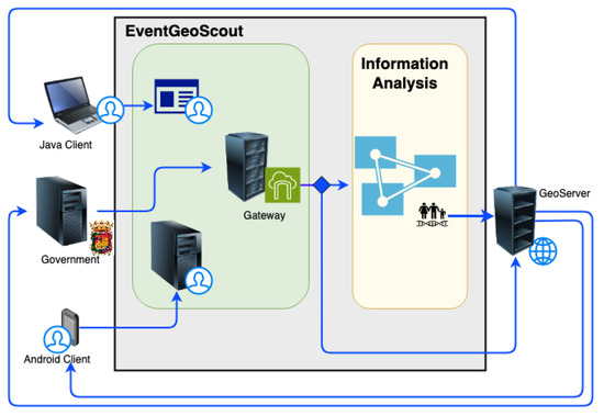The system framework includes a gateway that acts as a central link to various potential data sources. It performs several key functions: (a) configuration management, (b) user management, (c) integration with different spatial data sources, and (d) connection to external services for information retrieval. These functions are supported by a set of data layer management tools and an additional component that allows the gateway to interface with external geospatial data acquisition services using URLs as service parameters.