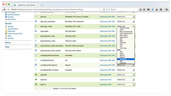 The life cycle of the open data is closed through a component, which links the gateway with GeoServer so as to publish, if so desired, the information layers on the server and allow this layer to be newly available to the ecosystem in the form of open data. In other words, we can receive a point set from a public organization, edit, or add new elements, and then, once more, publish them in GeoServer so that the institution can validate and update the information with the users’ contributions. As mentioned, this component allows the users’ information to be monitored, validating data and improving its quality. The inclusion of GeoServer means that the information in the framework is available to any GIS through the services that GeoServer offers, in this specific case, the Web Feature Service (WFS) [33]. In addition, once the data are stored in Geoserver, they can be translated into any standard format, as shown in Figure 3, thus freeing the other parts of the system from the management of formats and leaving this function to the Geoserver.