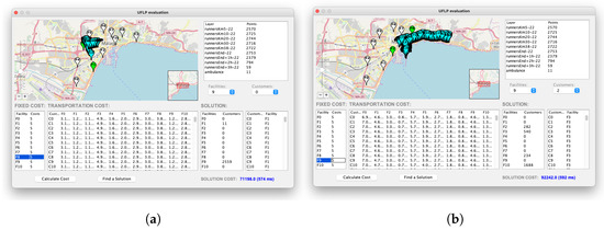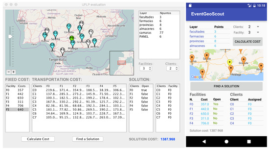 - UFLP: The ’UFLP’ button activates the Uncapacitated Facility Location Problem algorithm and allows the user to select two of the available layers—one designating the facility layer and the other acting as the client layer. The adaptable design of the application lends itself to different scenarios where the UFLP algorithm is applicable. While we have used it in the context of a marathon, the application can be seamlessly adapted for use in other mass events, such as Easter, the Malaga Fair, or the Three Kings Cavalcade, all of which are very popular in the city of Malaga. It is also important to note that this framework has the potential to be extended to other cities and scenarios involving geolocated citizens in need of services, such as ambulances and police, ensuring effective coordination and resource allocation.As an example of the versatility of the tool, in Figure 5, we show the execution of a problem to optimally locate a warehouse in a province of Andalusia. Note the difference in implementation between the Java and Android clients.