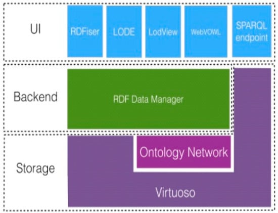 At the Backend level, we find the RDF Data Manager, which allows the insertion and querying of data as Open Linked Data in RDF format by the various modules of the UI level, namely: