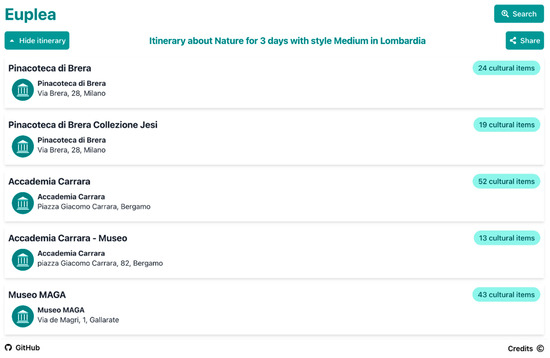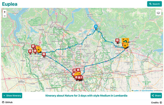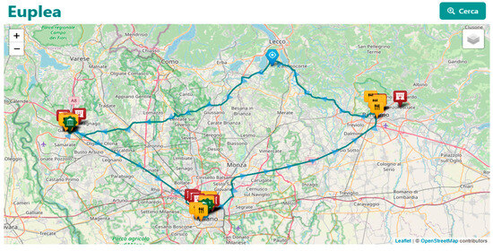 The polygon, which represents the optimal sequence with which to visit places of interest, is generated using the OpenSource Routing Machine service, providing the coordinates of the Cultural Sites and, if available, the user’s location [56].
