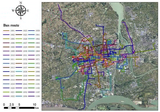 Yangzhou is located in the middle of Jiangsu Province, at the intersection of the Yangtze River and the Beijing-Hangzhou Grand Canal, and is an important part of Jiangsu’s Yangtze River Economic Belt. In addition, it is a city in the close circle of the Nanjing Metropolitan Circle and a city in the Yangtze River Delta city cluster, and one of the twenty-seven cities in the central area of the Yangtze River Delta, with a relatively well-developed urban road network. According to the 2020 census data of Yangzhou city, the population distribution is mainly concentrated in Guangling and Hanjiang districts, which are selected as the study area in this paper. The main urban area of Yangzhou City covers an area of 906.36 km2, with a total population of 1.2692 million people. Among them, the number of employees in primary industry is 95,500, the number of employees in secondary industry is 409,200, and the number of employees in tertiary industry is 474,800. It can be seen that the residential population in the main urban area of Yangzhou City is highly matched with the number of job positions available, indicating a relative balance between jobs and housing in the region, which further indicates that the main city of Yangzhou is mainly characterized by internal commuting. In addition, the public transportation system in the main city of Yangzhou is relatively complete, and transit is the main commuting mode of transportation. Therefore, this paper selects 51 bus routes within the main urban area of Yangzhou, including No. 1, No. 29, No. 37, No. 108, etc. (Figure 1).