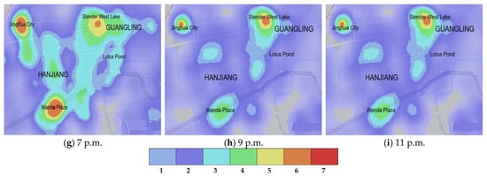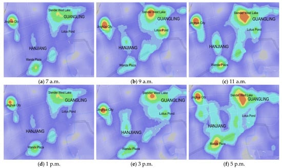 Heat maps of the central urban areas of Yangzhou on 9 May 2021. Record time is from 7 a.m. to 11 p.m.