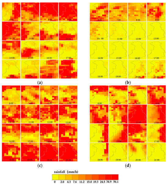 The spatio-temporal evolution of rainfall data in Yangzhou on 25–28 July 2021: (a) rainfall data on 25 July 2021; (b) rainfall data on 26 July 2021; (c) rainfall data on 27 July 2021; (d) rainfall data on 28 July 2021.