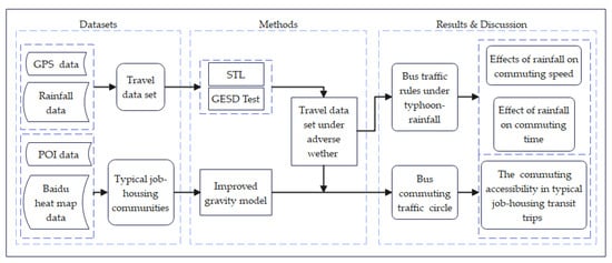 Given the shortcomings of the above studies in terms of temporal granularity [,], indicator selection and spatial analysis [], this paper will study the impact of typhoon-rainstorm events on commuting in Yangzhou City. Based on the public transportation GPS (Global Positioning System) trajectory data, remote sensing of rainfall data, Points of Interest (POI) data, Baidu heat map, related road networks and other data, the paper has employed multi-source heterogeneous big data mining and analysis techniques to first build a public transportation commuting circle of typical residential districts. Then, in-depth excavation of the temporal and spatial variation laws of average bus speed, travel time and commuting distance under different rainstorm intensities has been conducted to quantitatively assess the impact of typhoon-rainstorm events on commuting. The study is conducive to provide a scientific basis for traffic management departments to effectively prevent traffic congestion, ensure the reliability of the road network, and promote traffic management departments to manage urban traffic in a more refined way.