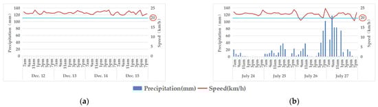 The temporal feature of average speed under different weather conditions: (a) normal weather; (b) typhoon-rainstorm.