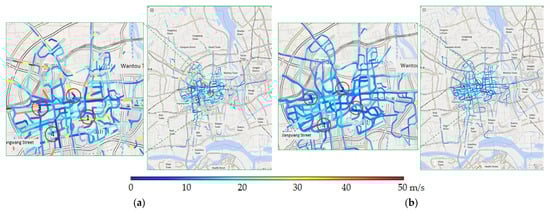 Spatial distribution of average speed under different weather conditions: (a) normal weather conditions; (b) typhoon-rainstorm weather conditions.