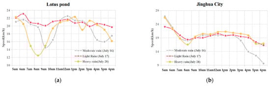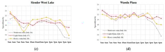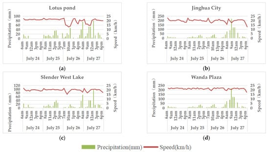 As is shown in Figure 9, under the conditions without rainfall (such as 12:00–18:00 on 24 July), the average bus speed of Lotus Pond, Jinghua City, Slender West Lake and Wanda Plaza was affected by the evening peak hours, and the speed in four areas showed fluctuations, among which Jinghua City and Slender West Lake were greatly affected, while Wanda Plaza was less affected.