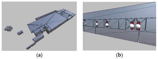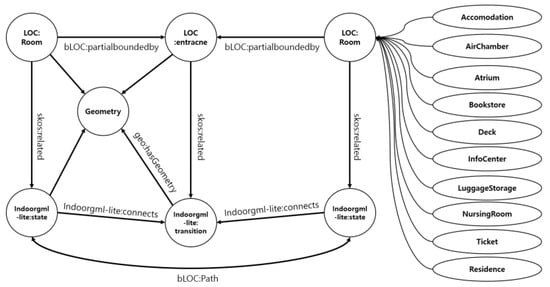 - IndoorGML [41] was developed by the OGC as a standard for representing indoor spatial models and functions as an exchange format. IndoorGML can represent attributes of individual indoor spaces, connections between spaces, and indoor Points of Interest (POI). It is characterized by its compatibility with BIM, CityGML, and various spatial information data.