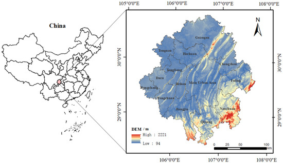 The Chongqing metropolitan area is located in the western part of Chongqing and the eastern part of the Chengdu–Chongqing urban agglomeration. It includes 21 districts, including the central urban area and the main urban new area of Chongqing as well as the entire administrative area of Guang’an City in Sichuan Province. The total area covers 35,000 square kilometers, and in 2020, the permanent population was 24.4 million people. The Chongqing metropolitan area is a significant urban cluster in the central-western region of China. In 2022, a development plan was approved by the National Development and Reform Commission and jointly issued by the People’s Government of Chongqing Municipality and the People’s Government of Sichuan Province under the title “Development Plan for the Chongqing Metropolitan Area”. This marks the first inter-provincial urban cluster planning initiative in the central-western region, signifying a crucial step in urbanization and economic cooperation in the area. The development of the Chongqing metropolitan area will serve as a vital engine for the overall development of the central-western region, demonstrating positive exemplary effects on regional cooperation and urban development at the national and international levels. The geographical location and scope of the study area are illustrated in Figure 1.