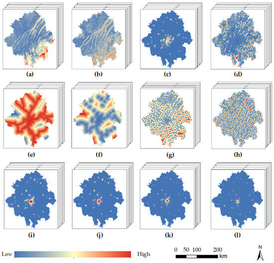 Driving factors of LUCC: (a) DEM; (b) slope; (c) nighttime light; (d) distance to main road; (e) distance to railway; (f) distance to train station; (g) distance to town center; (h) distance to river; (i) density of schools; (j) density of hospitals; (k) density of amenities; (l) population.