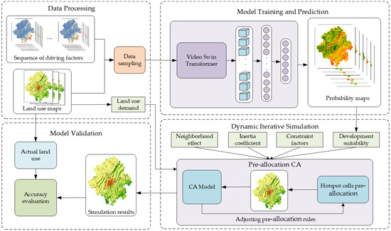 In response to the above issues, this study proposes a cellular automaton model based on spatiotemporal feature learning and pre-allocation, named video swin transformer pre-allocation CA (VST-PCA). The core of this model lies in leveraging the video swin transformer to deeply learn spatiotemporal features, aiming for a more accurate understanding of the complex dependency between land use and driving factors, thereby determining suitability for land development. Additionally, a pre-allocation strategy is incorporated into the CA iterative simulation process. Before each round of iterative simulation, potential hotspots with higher overall transition probabilities are pre-allocated to achieve more accurate simulation results. To evaluate the effectiveness of the VST-PCA model, we selected the Chongqing urban agglomeration as the study area and simulated the LUCC in 2020. We extensively compared the simulation results with two traditional machine learning-based CA models and two deep learning-based CA models. The subsequent sections of this paper are organized as follows. Firstly, we introduce the study area and data sources, followed by a detailed description of the overall framework of the model, core principles, and methods to evaluate the simulation results. Then, we present the experimental results and compare the performance of each model. Finally, we summarize the research findings and discuss future research directions.