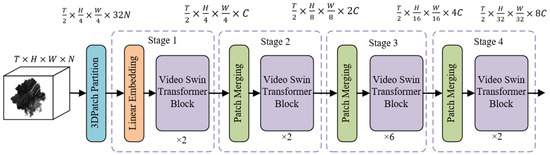 This study employs a miniature version of VST (Swin-T) for feature extraction, and the overall architecture of the model is illustrated in Figure 4, divided into four stages for feature extraction. The size of the input sample’s driving factor data is defined as , where represents a sequence composed of periods. Each period contains grids, with and denoting the height and width of the input grid image, and representing the number of driving factors. After passing through the 3D patch partition layer, the input driving factor data is segmented into several 3D tokens. In Stage 1, a linear embedding layer projects the features of each token into an arbitrary dimension represented by C [42], which is then input into the VST block. In Stages 2, 3, and 4, the patch merging layer combines adjacent 2 × 2 patches, applying linear layers to achieve down sampling and feature doubling effects, followed by input into the VST block. Through the staged feature extraction process, the model gradually extracts and merges spatiotemporal feature information from the driving factor sequence.