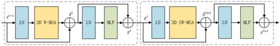 The main components of the model consist of the VST module, which is composed of an alternating 3D window multi-head self-attention (3D W-MSA) module and a 3D shifted-window multi-head self-attention (3D SW-MSA) module. The specific structure of the VST block and the connection between two consecutive VST blocks are illustrated in Figure 5. Each VST block is comprised of a 3D (shifted) window-based MSA module and an MLP. Layer normalization (LN) is applied before each MSA module and MLP module, and residual connections [43] are applied after each module. Based on the shifted-window partitioning method, the feature maps in two consecutive VST blocks are calculated as follows: