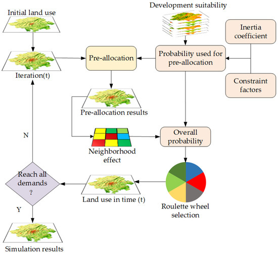 where represents the demand for land use type , represents the current quantity of land use type , and denotes the pre-allocation ratio. is a customizable parameter with a range of 0 to 1. A higher value indicates a greater influence of pre-allocation on the overall simulation. In this study, it was set to 0.1.