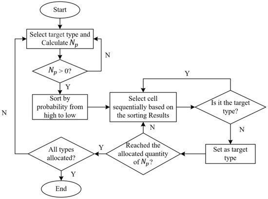 The overall process of the pre-allocation strategy is illustrated in Figure 7. Specifically, the target type is sequentially chosen for allocation, excluding land use types with reduced demand from pre-allocation. Subsequently, the number of hotspot cells pre-allocated for target type are calculated; the cells are sorted in descending order based on the probability ; and then, according to the sorting results, cells of non-target types are consecutively selected for allocation until the allocated quantity reaches . After completing the pre-allocation for the current target type, we move on to the next target type, repeating the aforementioned steps until the pre-allocation for all types is completed. This yields the pre-allocation results for the current round of iterative simulation. The quantity for pre-allocating target type is defined as follows: