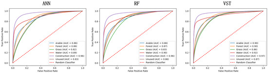 After processing the data through the data processing module, a unified dataset is obtained. In this study, 5% of the data was randomly stratified as samples, resulting in a final set of 175,000 samples. Among these, 70% of the samples were used as the training set, while the remaining 30% were used for model validation. Table 2 presents detailed information about the dataset. Currently, most research related to LUCC simulation tends to use traditional machine learning models as tools for extracting development suitability, and these models are favored by researchers for their simplicity and efficiency. In this regard, we compared the development suitability maps generated in this study with those generated by ANN and RF. The ROC curves for each model are shown in Figure 8, where the red dashed line represents a random classifier. Table 3 lists the AUC values for the development suitability maps generated by each model. The results indicate that the VST model used in this study achieved the best performance across various land use types. The AUC values for cropland, forest land, water bodies, and construction land all exceeded 0.9, demonstrating that VST can generate more accurate development suitability maps, laying the foundation for subsequent simulation stages and improving the predictive performance of the model.