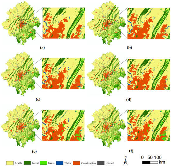 Comparison of land use simulation results and actual results in 2020: (a) simulation results of ANN-CA; (b) simulation results of RF-CA; (c) simulation results of CNN-LSTM-CA; (d) simulation results of ST-CA; (e) simulation results of VST-PCA; (f) actual LU map.