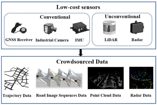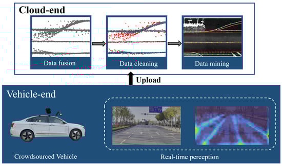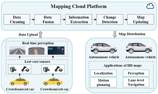 There are two commonly used methods for producing and updating HD maps. The first method involves using mobile mapping systems (MMS) equipped with high-precision light detection and ranging (LiDAR), high-definition cameras, and accurate positioning devices to collect data in specific areas [17]. Subsequently, the collected data undergo processing and feature extraction to generate HD maps. This approach is known as centralized production and the updating of HD maps. While maps produced using this method exhibit high accuracy, they require expensive sensors and skilled professionals to conduct map acquisition and production. With advancements in sensor technology, the cost of cameras and global navigation satellite system (GNSS) positioning devices has decreased. Consequently, more vehicles are equipped with these sensors, enabling partial implementation of advanced driver-assistance features. Simultaneously, these sensors can be utilized for data collection and perception. The collected data are transmitted to the mapping cloud platform for data cleaning, fusion, and information extraction, facilitating updates to HD maps. This approach, known as the crowdsourced updating of high-definition maps, eliminates the need for expensive sensors and allows for large-scale map updates. However, compared to centralized methods, this approach involves a more complex technical path.