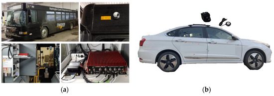Today, some massive commercial vehicles are equipped with onboard sensors such as IMU, GPS, wheel encoders, and cameras, which can gather substantial road-related data for crowdsourced updates to HD maps [31], as shown in Figure 4a. Bu et al. utilized a monocular camera setup with a GPS system onboard a commuter bus traveling between downtown Pittsburgh and Washington, Pennsylvania, to autonomously detect changes in pedestrian crosswalks at urban intersections [32]. Moreover, Korean IT company SK Telecom installed camera devices to collect crowdsourced data, which are called the Road Observation Data (ROD) on public buses in Seoul. Kim et al. used this data to update lane information for HD maps [33]. Apart from buses, many private vehicles and ride-hailing cars are also equipped with cameras [34], at present as shown in Figure 4b. Yan et al. cooperated with automobile manufacturers to collect image or video data, along with GPS information during driving, with the users’ consent to update lane information in HD maps [35].