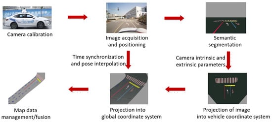 The aforementioned methods all require calibration to obtain the intrinsic and extrinsic parameters of the monocular camera. This step is necessary to transform the extracted local HD map information from the camera coordinate system to the 3D geographic coordinate system through perspective transformation. However, the process of camera calibration typically demands expertise, relying on experimentation and calculations to acquire the camera’s intrinsic and extrinsic parameters. Therefore, some researchers have proposed HD map-construction methods that do not rely on the intrinsic and extrinsic parameters of cameras or smartphones [36,37,38]. Chawla et al. proposed a method for extracting 3D positions of landmarks in HD maps [36]. This approach is used only on a monocular color camera and GPS without assuming the known camera’s intrinsic and extrinsic parameters. Methods that do not require calibration simplify the deployment process of monocular camera setup and make it easier to install on different platforms. However, the absence of calibration may result in the inaccurate estimation of the camera intrinsic and extrinsic parameters, impacting the accuracy and precision of the collected data. To address this issue, more complex post-processing is needed to correct distortions in the images.