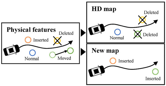 The probability-based change-detection methods are the current mainstream approaches for detecting changes in HD maps [92]. Commonly used methods include particle filtering [93,94], cost functions [33,95], and random variable approaches [90]. To detect and manage the physical changes in the HD maps, probability-based methods typically categorize map features into three classes: normal features, deleted features, and newly added features [93,96], as shown in Figure 11. Subsequently, by assessing the degree of match between feature information and the existing HD map, the probability of feature existence is estimated. Data with higher existence probabilities are retained in the HD maps, while data with lower existence probabilities are removed. To detect errors in HD maps, Welte et al. used location information to assess map quality and proposed a Kalman filter-smoothing method with residuals. They employed the covariance intersection of residuals for error detection [96]. Probability-based methods are an effective means for HD map updating. This approach aligns features from crowdsourced map with those in the HD map, calculating the change probability based on the alignments. While this method entails longer computational cycles and involves complex algorithms, it plays a crucial role in maintaining the precision of HD maps. By continuously monitoring the HD map with multiple crowdsourced maps over a period, it provides real-time updates to change probabilities, thereby enhancing the reliability of map updates.