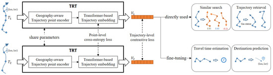 The goal of universal representation is to train a single model that maps raw data into low-dimensional and useful vectors. The learned representations should incorporate latent features and can be effectively applied to various applications [24]. Many scientific research fields have started to investigate universal representation learning, such as face recognition [25], computer vision [26,27], and time series analysis [28]. However, only a few works have explored universal trajectory representation learning. Fu et al. [29] mapped trajectories into road segments based on a map-matching technique and then used a seq2seq model to learn trajectory representations. It is the first time that trajectory representation has been applied to multiple downstream applications. Chen et al. [30] proposed the Toast to learn both road segment representations and route representations and apply them to different transport planning tasks. These works incorporate road networks and other external data, whereas our work focuses on trajectory representation learning and does not include such rich information. Furthermore, these methods fail to consider spatial correlations between trajectory points, whereas our work incorporates a geography encoder to model them. The differences between our method and theirs also lie in the Siamese architecture and the new training strategy. It is possible to combine them to achieve further improvements in multiple traffic-related tasks.