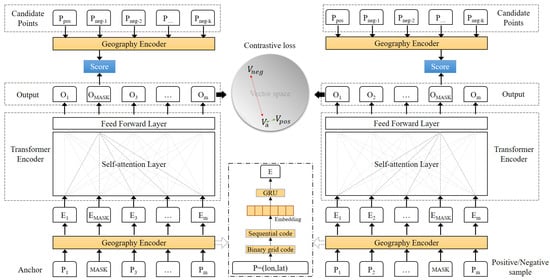 Sequence data are the data points that are organized in a specified order, such that earlier data points provide information about later data points. Text data, trajectory data, DNA and protein sequences, and time-series observations are typical sequence data. Recently, inspired by the success of NLP, the idea of learning representations from sequence data has been widely applied. The most commonly used is the Recurrent Neural Network-based encoder–decoder model [13], such as sequence-to-sequence learning [14,15]. The encoder embeds an input sequence to a low-dimension vector, and the decoder reconstructs the original sequence by giving the vector. The learned vector can be applied in specific mining algorithms as a representation of high-dimensional data. Another promising method for sequence modeling is the transformer [16], whose self-attention mechanism has the capacity to capture long-range dependencies. For example, Gao et al. [17] propose the simCSE for generating sentence embedding, which takes BERT [18], a variant of the transformer, as the encoder and applies the contrastive learning framework. Different from the above representation learning models for NLP, which takes discrete tokens (i.e., words) as input, our task requires processing trajectory points with spatial proximity relation. To this end, we propose a geography-aware encoder for embedding trajectory points and modify the loss function for perceiving spatial proximity.