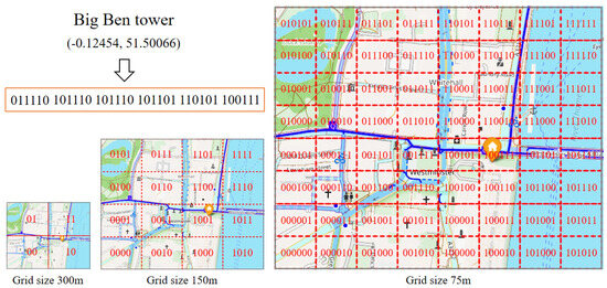 Spatial discretization is widely applied in trajectory feature engineering. Trajectory points are mapped into spatial grids and represented with numeric grid IDs to overcome the sparsity issue. However, the common numeric ID may result in the omission of geospatial proximity between GPS points. To this end, a novel map-gridding scheme is introduced. We first divide the world map into hierarchical grids by using a recurrent four-partition of space. And then, the GPS point located inside the grid can be represented by a binary Morton code [32]. When the number of partitions increases, the grid size decreases, and the code length increases. As illustrated in Figure 3, the Big Ben clock tower (longitude = −0.12454 and latitude = 51.50066) is mapped into a grid and represented by the code “011110101110101110101101110101100111”. In this way, the strong interaction between latitude and longitude can be fully modeled during the trajectory point mapping. Furthermore, spatially adjacent grids share the same coding prefix, such that the geospatial proximity between trajectory points can be preserved as much as possible.
