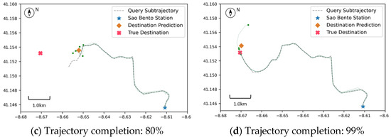 We compare the prediction results at 40%, 60, 80%, and 99% percentage of trajectory completion. Figure 4 illustrates an example of how our model for final destination prediction works for a trajectory selected randomly among the Sao Bento dataset. We find that the prediction accuracy is proportional to the trajectory completion. This is expected since the more information we know about a trajectory, the more accurately we can identify which cluster it belongs to. The performance of all methods is summarized in Table 4. The prediction error of seq2seq and vTrans is larger. Trember and t2vec show similar performance. MLP-C, a model specifically designed for destination forecasting, surpasses other baseline methods. Our method achieves competitive performance, demonstrating that the trajectory representation learned by TRT preserves adequate trajectory information. Thanks to contrastive learning, learned representations are uniformly distributed in the vector space. The representations of similar trajectories are close, and the representations of dissimilar trajectories are distant, making it easier for the fine-tuned model to classify them.