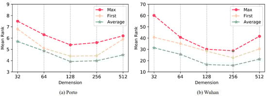 Due to the lack of ground truth labels for evaluating the performance of models, we follow the evaluation methodology in [41], which has been widely adopted in related works. Specifically, we randomly selected 100,000 trajectories from the test set, denoted as . For each trajectory , we orderly extract the points from it in odd and even positions, yielding two sub-trajectories, denoted as and , such that we can construct two the dataset and . Next, we treat the first 10,000 trajectories from as query dataset, denoted as . For each query , we measure its distance to trajectories in using different methods and calculate the rank of . Ideally, trajectory should be ranked first due to and being generated from the same trajectory. Finally, we calculate the mean rank of 10,000 queries in as the result of similarity computation. Note that we use the cosine distance to measure the similarity between trajectory embeddings.