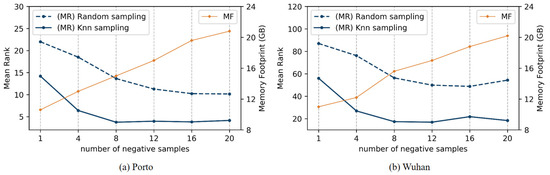 In our method, we use 6-character sequence codes to represent spatial grids. The grid size is about 75 m. The dropping and distorting rate of input trajectories is set from 0.0 to 0.6. In the geography encoder, both the hidden layer size of GRU network and the output trajectory point representation are set to 128. To make a fair comparison, the default hidden layer size is also set to 128 for all methods. Two scale parameters θ and τ in loss functions are set to 0.1 and 0.05. During the training process, we use the Adam optimizer with a learning rate of 1 × 10−3, and the number of training epochs is set to 30 for the Porto dataset and 20 for the Wuhan dataset. All models are implemented on a machine with two GTX 2080Ti GPUs and an Intel i7 7700K CPU using the open-source framework PyTorch 1.8.1.