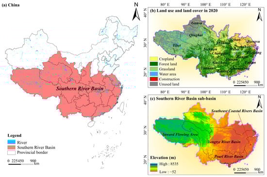 The location and topographic layout of the study site. (a) Geographic positioning of the study site within China. (b) Distribution of LULC in the study site in 2020. (c) Elevation mapping of Southern River Basin sub-basin.