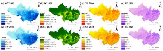 - WESs supply calculation. Utilizing the Millennium Ecosystem Assessment (MA) framework alongside the Common International Classification of Ecosystem Services (CICES), this study selected vital WESs, specifically, WY, SC, and WP (as depicted in Table 5). Employing the respective ecological models, a spatial mapping approach was employed to compute the supply of these WESs from 2000 to 2020.