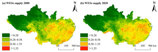By analyzing the spatial and temporal dynamics of the supply of each WESs from 2000 to 2020 (Figure 3), the high WY values are mainly distributed in the southeast and coastal regions. Higher SC values were found in Sichuan and Hubei provinces, while lower SC values were found in the western region. The NE and PE showed a pattern of high values in the central and northeastern regions and low values in the western region. From 2000 to 2020, spatial patterns changed little. From 2000 to 2020, overall WESs values were higher in the central and coastal mountainous areas, with a widening trend in the low values (Figure 4). Among them, the results of the Guangdong study in this paper are consistent with those of Xu et al. [] in the Guangdong region.