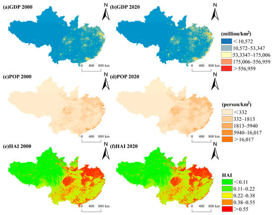 where ESD is the demand for WESs and , , and are the LULC intensity, POP (unit: person/km2), and GDP (unit: million/km2), respectively. According to Wu et al. [], was the intensity index of human activities (HAI). POP and GDP indicators were integrated into the calculation of WESs demand without affecting the overall distribution, using a logarithmic statistical approach that weakens localized sharp fluctuations to facilitate analysis. was calculated as follows: