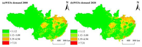 The spatial and temporal dynamics of demand for various WESs are characterized by a significant increase in GDP from 2000 to 2020 (Figure 5). In 2000, the per capita GDP was only 2 × 108 CNY/km2, whereas in 2020, it had surpassed 3 × 109 CNY/km2. High-value areas are located mainly in the central and coastal areas. Areas with high population densities are mainly located in the coastal areas. From 2000 to 2020, there was a general trend of expansion. Land development intensity was highest in the northern and coastal regions. Construction increased significantly, by 50% or more. The demand for WESs is higher in the northern and coastal regions (Figure 6). Demand for WESs has increased dramatically in high-value areas along the coast.