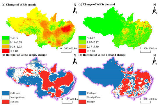 This study examines the spatial evolution of changes in the supply and demand of WESs from 2000 to 2020 (Figure 7). The results show that the supply of WESs in the study area decreased significantly in coastal areas, while the supply of WESs in most other areas coexisted with increases and decreases. The demand for WESs shows a growing trend in coastal areas and developed cities, with rapid growth. Meanwhile, there was a slight increase in the demand for WESs in the northern mountainous regions. The spatial aggregation traits of changes in both the supply and demand of WESs support subsequent spatial zoning and governance efforts. Regarding the supply of WESs, the northern region stands out as a crucial cold spot area, whereas the central, northern, and Pearl River Delta regions emerge as notable hot spots. The demand for WESs has increased significantly, and Yunnan, Fujian, and other places are important cold spots.