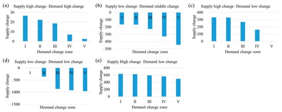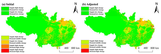 Based on the above principles, the spatial changes in both the supply and demand of WESs were overlaid to derive their spatial pattern. The six types of changes in WESs supply and demand encompass scenarios like high supply change–low demand change, low supply change–low demand change, high supply change–middle demand change, low supply change–middle demand change, high supply change–high demand change, and low supply change–high demand change (Figure 8a). However, fewer of the regions exhibiting high supply change–high demand change and low supply change–high demand change within the studied areas (Table 7). These two types contribute to a relatively scattered zoning pattern and weaker zoning indicators overall. Following the principle of regional covariance and similarity in characteristics, the category of low supply change–high demand change was consolidated into the high supply change–high demand change classification.