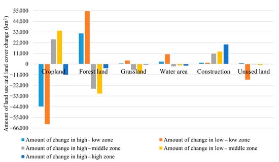 The influence of LULC changes on the variations in the supply and demand of WESs has been extensively acknowledged across diverse studies [,]. In the Southern River Basin, the overall characteristics of LULC changes reveal a significant increase in construction alone (Figure 10). In the high supply–high demand zone, all types of LULC changes are transformed into construction areas, with the area of construction increasing from 9208 km2 in 2000 to 29,412 km2. The expansion of construction areas has brought severe human disturbances to natural ecosystems, posing significant threats that may endanger the living environments of various organisms within these ecosystems []. In the high supply–high demand zone, the areas of natural ecosystems such as cropland, forest land, grassland, and water have all decreased, thereby limiting the supply level of WESs. Chen et al. [] also reported the same results. In the high supply–high demand zone, the areas of grassland and unused land are the least, decreasing to 90 km2 and 169 km2, respectively. Forest land, grassland, and water only increase in the low-demand zone of WESs. Cropland increases in the middle demand zone. Wang et al. [] have also demonstrated that during periods of stable economic growth, the area of cropland gradually increases. However, when the economy experiences rapid growth, the cropland area is damaged, primarily due to the continuous increase in construction areas. From Table 8 and Figure 9, it can be observed that the changes in the supply of various WESs in all zones are significantly affected by changes in WESs demand. When the changes in WESs demand exceed the middle level, the extent of influence of HAI, FLP, and GLP on WESs demand becomes increasingly larger. At the same time, the area of construction increases the most in the high supply–high demand zone. Therefore, the intensification of LULC changes may amplify the impact of WESs demand on WESs supply.