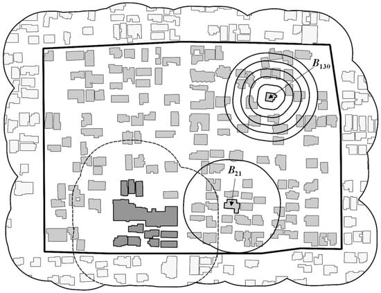 The building footprints in the study area in the Shibuya ward in Tokyo. The gray polygons are buildings in the study area. The white polygons are buildings in the peripheral area surrounding the study area and are used for edge correction. The circular curve centered at B21 is the 50 m wide buffer zone around B21. The circular rings centered at B130 are 10 m with buffer rings surrounding B130. The broken circular curve around the clump of the dark gray buildings is the 50 m wide buffer zone around the clump.