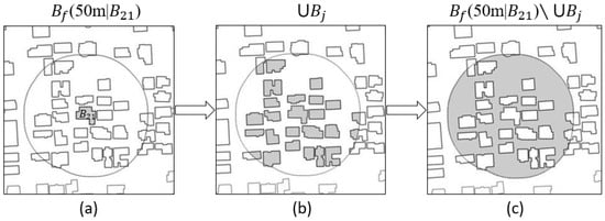 - Step 3: Compute the open space in the buffer zone of by excluding the union of all buildings obtained in Step 2 from the buffer zone obtained in Step 1, i.e., in Equation (1). This computation is performed by a GIS difference operator (Figure 2c).