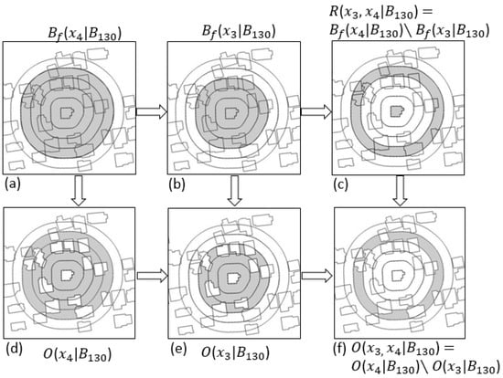 It should be noted that the open space in the local open-space ratio function defined by Equation (1) is cumulative concerning x-width. Therefore, we cannot directly determine in which part of the x-width buffer zone the open-space ratio is high or low. More explicitly, we consider buffer rings surrounding Building . For example, in Figure 1, the circular hairlines indicate the buffer rings with 10 m intervals surrounding in the 50m width buffer zone. The j-th ring, , is obtained by excluding the -width buffer zone (e.g., in Figure 3a) from the -width buffer zone (e.g., in Figure 3b), i.e., = , , where , and (e.g., in Figure 3c is obtained by substracting in Figure 3a from in Figure 3b). Similarly, the open space, , in a ring (e.g., in Figure 3f) is obtained by excluding the open space in the -width buffer zone (e.g., in Figure 3e) from that in the -width buffer zone (e.g., in Figure 3d), i.e., = . In these terms, the open-space ratio in a ring is written as: