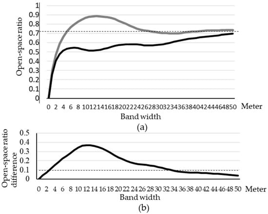 (a) Cumulative local open-space ratio function of Building indicated by the thick black curve and that of Building indicated by the thick gray curve. The upper dotted horizontal straight line shows the average open-space ratio in the whole study area. (b) The difference in open-space ratio between the two open-space ratio functions. The dotted horizontal line indicates that the difference in the open-space ratio is 0.1.