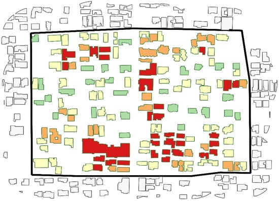 Given the open-space ratios in the 15 m wide buffer zone and the number of classes is four, we used the Ward hierarchical cluster method []. The resulting classified buildings are indicated by color in Figure 7. Buildings with the same color share similar local open-space ratios. The buildings colored red are those with the lowest open-space ratio and the buildings colored green are those with the highest open-space ratio. The map in Figure 7 is useful for discussing the open space environment created by the mix of buildings with different open-space ratios in a district.